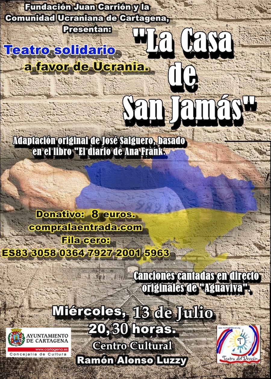 Se trata de una iniciativa impulsada por la Fundación Juan Carrión y la Asociación de Ucranianos de Cartagena, gracias a la colaboración del Ayuntamiento y del Grupo El Desván, quienes representarán esta función, enmarcada dentro del acto de final de curso 2021-22 de su Aula Taller de Teatro.
