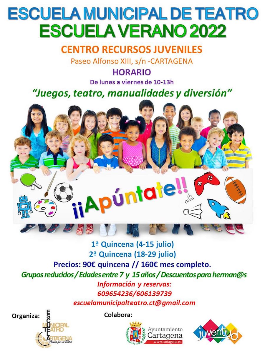 Leer más...Destinada a chavales de entre 7 y 15 años de edad, se va a desarrollar en el centro de recursos juveniles de Cartagena durante el mes de julio organizada por la Escuela Municipal de Teatro.