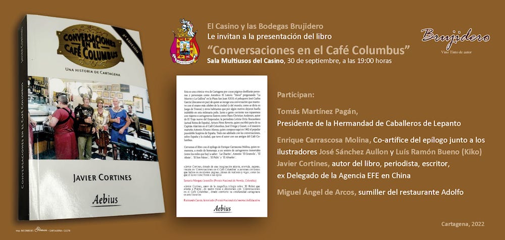 En la puesta de largo en Cartagena de ‘Conversaciones en el café Columbus - Una historia de Cartagena’, Javier Cortines estará acompañado por Tomás Martínez Pagán (presidente de la Hermandad de Caballeros de Lepanto), Enrique Carrascosa Molina (co-artífice del epílogo) junto a los ilustradores José Sánchez Aullón y Luis Ramón Bueno (Kiko) y Miguel Ángel de Arcos (sumiller del restaurante Adolfo).