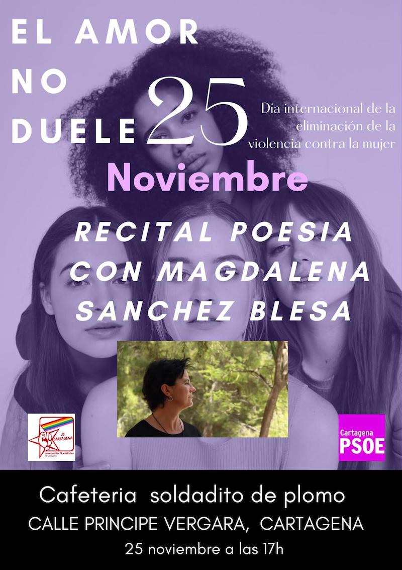 'El amor no duele'. Bajo este lema se ha celebra hoy, 'Día mundial de la eliminación de la violencia contra la mujer', con Magdalena Sánchez Blesa en la cafetería 'Soldadito de plomo', a partir de las 17 horas, organizado por Juventudes Socialistas y PSOE Cartagena.