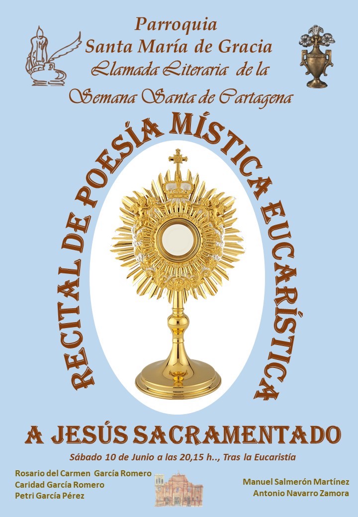La parroquia de la calle del Aire de la ciudad de Cartagena acoge el recital de poesía mística-eucarística a Jesús Sacramentado. Comenzará a las 20.15 horas con participación de Rosario del Carmen García Romero, Caridad García Romero, Petri García Pérez, Manuel Salmerón Martínez y Antonio Navarro Zamora.