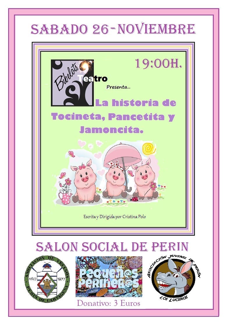 El salón social acogerá el 26 de noviembre la representación de ‘La historia de Tocineta, Pancetitta y Jamoncita’, a partir de las 19 horas. Organizan Asociación de Vecinos, ‘Pequeños perineros’ y Asociación Juvenil ‘Los Luceros’.