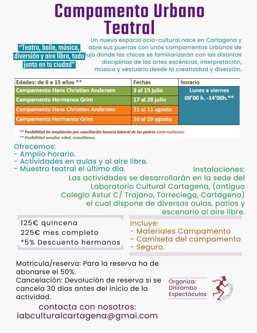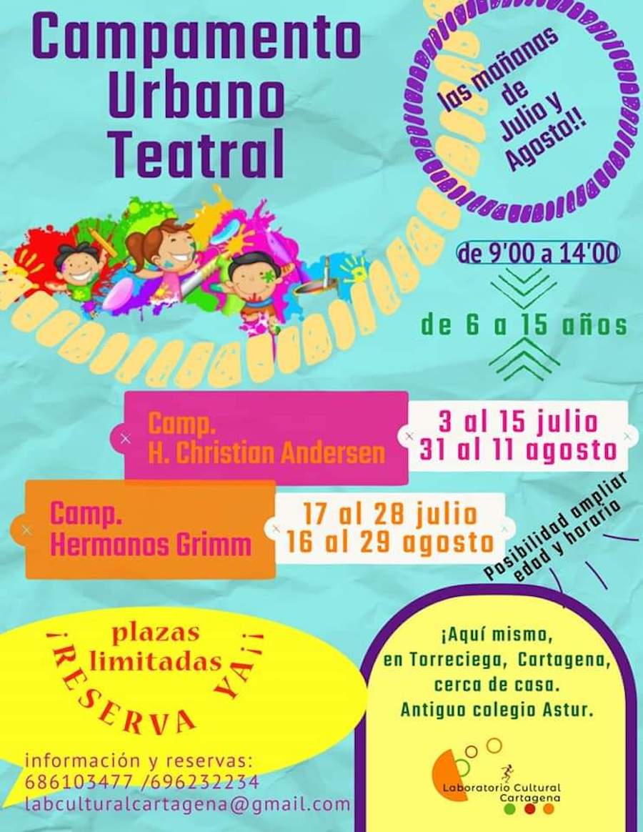 Organizado por Laboratorio Cultural Cartagena, se va a desarrollar en las mañanas de julio y agosto para chavales de 6 a 15 años de edad en Torreciega, en el antiguo colegio Astur. Un campamento lleva el nombre de Hans Cristian Andersen y el otro de Hermanos Grimm.