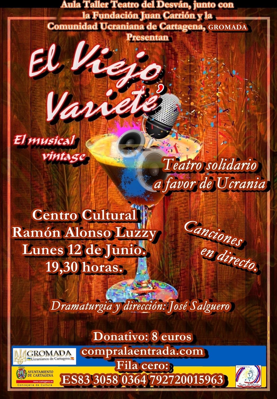 El musical solidario 'El viejo Varieté' recaudará fondos en favor del pueblo ucraniano gracias a la colaboración del Ayuntamiento de Cartagena. El dinero percibido se destinará a la compra de medicamentos y otros materiales necesarios. La obra de teatro, tendrá lugar hoy lunes, 12 de junio, a las 19:30 horas, en el salón de actos del centro cultural Ramón Alonso Luzzy.El Aula Taller de Teatro del Grupo El Desván cerrará el curso 2022-2023 con esta iniciativa solidaria que cuenta con el apoyo de la Fundación Juan Carrión y la Asociación de Ucranianos de Cartagena “Gromada”, gracias a la colaboración del Ayuntamiento de Cartagena.