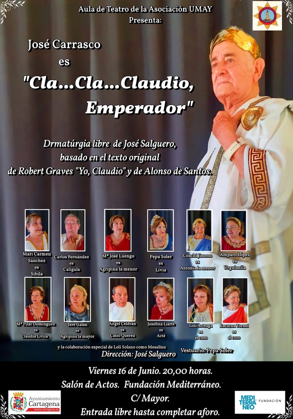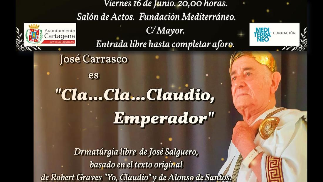 El aula de cultura de la Fundación Mediterráneo acoge, de las 20 horas y con entrada gratuita, la representación teatral 'Cla...Cla...Claudio Emperador', con José García Carrasco como actor principal y con dramaturgia libre de José Salguero sobre el texto original de la obra de Robert Graves 'Yo, Claudio' y de Alonso Santos. Organiza Aula Umay de Teatro.