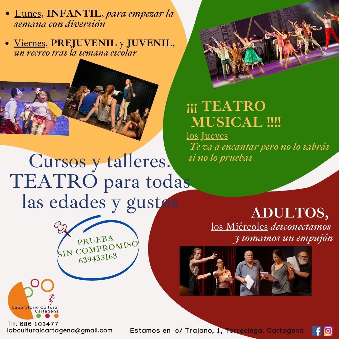 Laboratorio Cultural de Cartagena ofrece cursos y talleres de teatro para todas las edades en su sede de Torreciega. Se puede probar si compromiso.