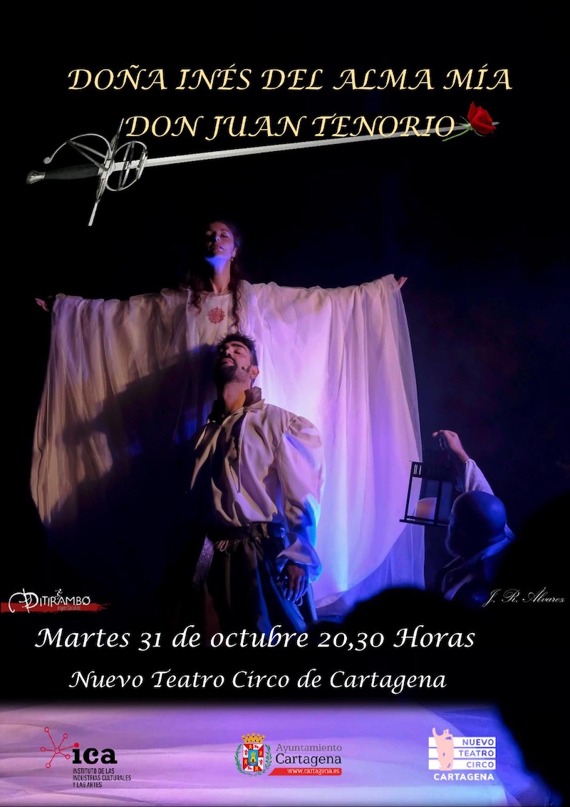 'Doña Inés del alma mía', la versión de Zorrilla que ha representado la compañía cartagenera 'Ditirambo' los dos últimos años ante la fachada de la Sociedad Económica de Amigos del País, en la calle del Aire, pasa al Nuevo Teatro Circo. Será el martes 31 de octubre, a partir de las 20.30 horas. José Molina y Miriam Ortas Gómez son los que interpretan a la popular y sufrida pareja de amantes.