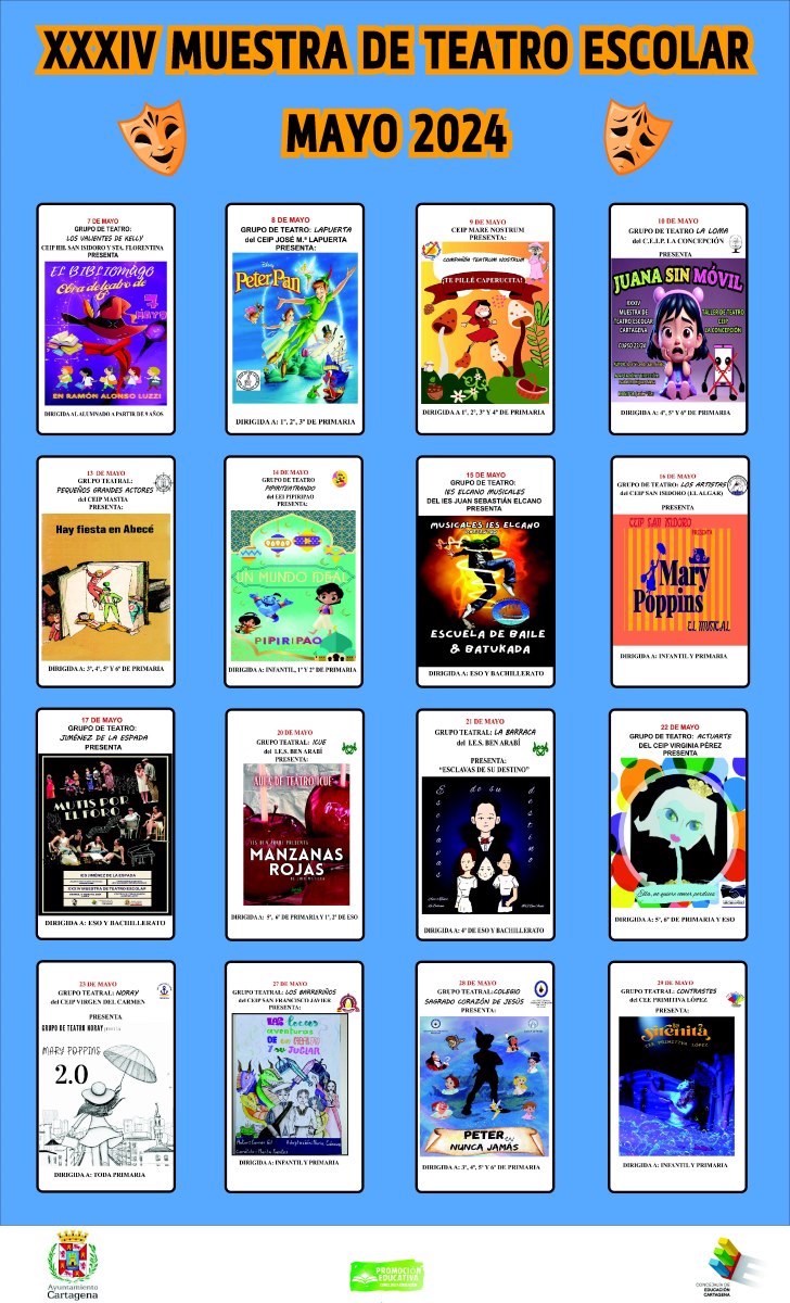 Dieciséis grupos de teatro de otros tantos centros escolares del municipio van a representar sus obras durante el mes de mayo en la XXXIV Muestra de Teatro Escolar de Cartagena, que organiza la Concejalía de Educación del Ayuntamiento de Cartagena.