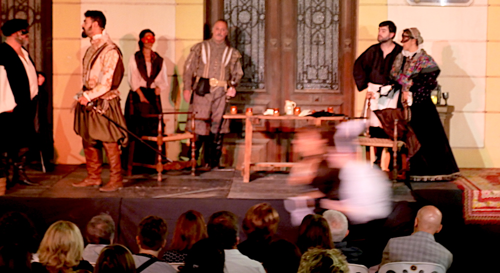 La representación de la versión del Tenorio en la calle del Aire tuvo algunas detalles fuera de guión. Unos eran previsibles, como el sonido de las campanas de Santa María, pero otros fueron inesperados, como el paso de personas disfrazadas de 'Halloween' ante el escenario en lugar de utilizar el paso habilitado y, en especial, el tránsito de un repartidor de pizzas en moto.