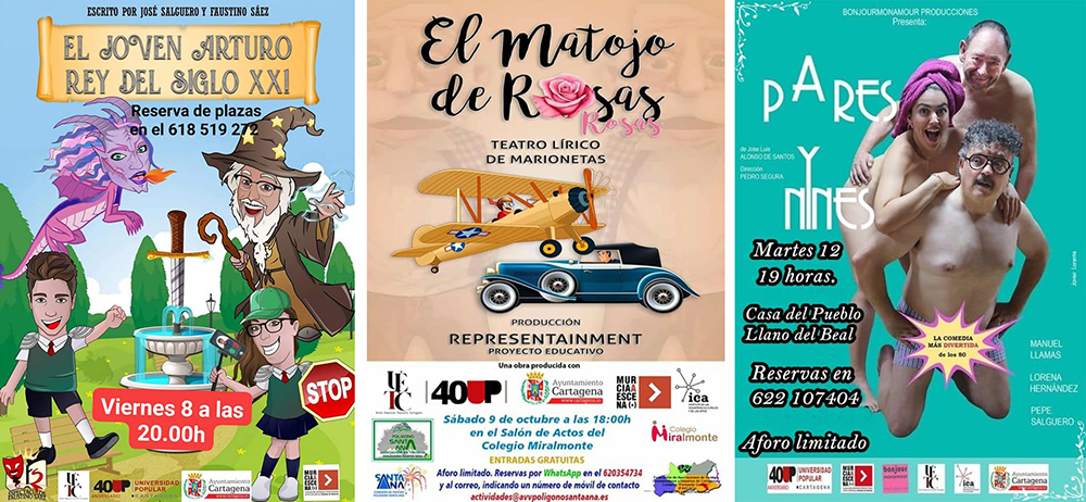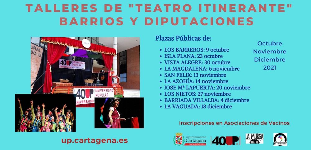 La Universidad Popular, dentro de la celebración de sus cuatro décadas de historia, impartirá talleres teatrales por el municipio con un tope de 25 participantes para cada uno. Los núcleos de población donde se desarrollarán del 9 de octubre hasta el 18 de diciembre son Los Barreros, Isla Plana, Vista Alegre, La Magdalena, San Félix, La Azohía, José María Lapuerta, Los Nietos, Villalba y La Vaguada.